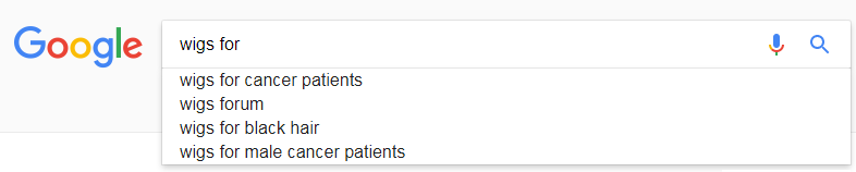 以wigs(假发)为例,在Google的搜索框输入wigs,谷歌会自动给出提示。