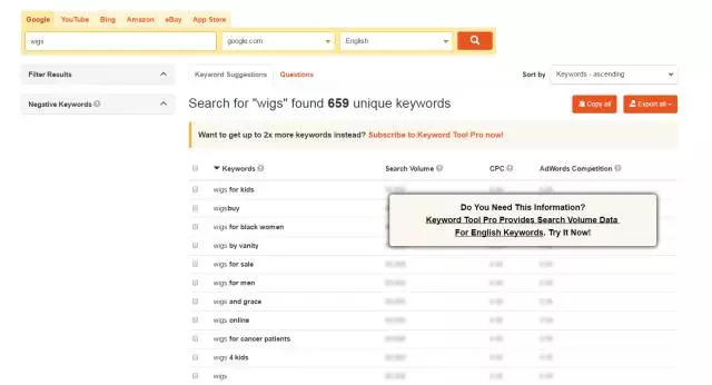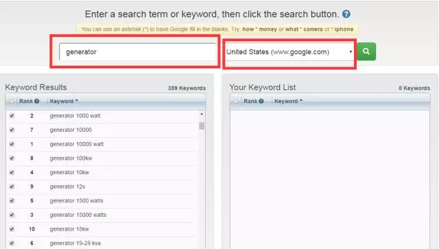 这个工具和 Keyword.io一样属于专家级神器。可以用个来做关键词筛选,表格导出,但是想看到关键词的搜索量,单次点击价格及adwords的竞争程度需要付费。