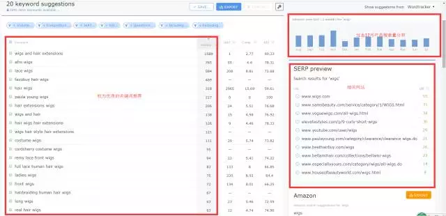 YouTube,Bing, Yahoo, Ebay, Answers, Google 和Wiki上面与输入的关键词相关的关键词都会第一时间显示在当前网页上。以wigs为例,我们感受一下吧:
